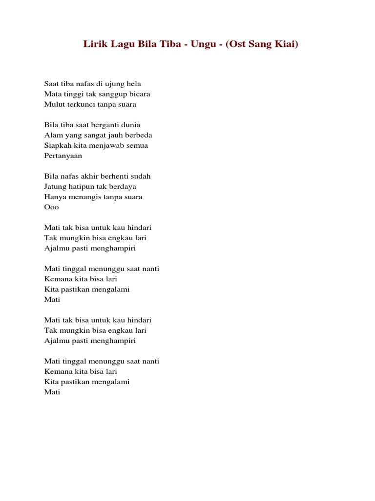 Bila nafas akhir berhenti sudah Jantung hatipun tak berdaya Hanya menangis tanpa suara. Sang Kiai - Ungu. Bila tiba saat berganti dunia Alam yang sangat jauh berbeda Siapkah kita menjawab semua Pertanyaan.